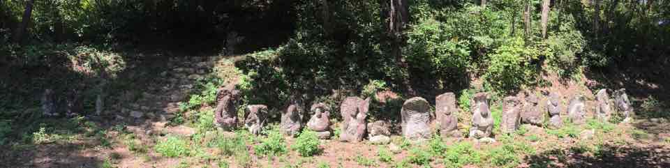 ホトケヤマ展望台頂上手前で左に下る 小径の先に見られる。この石仏群は2015年,町の教育委員会が調査に入り現段階で次の内容が報告されている。